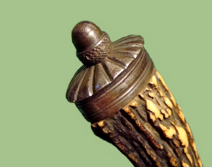 The design of the hunting cutlas handle was of clamshell type. Stag bone handle without any type of ornamentation.