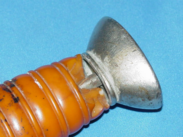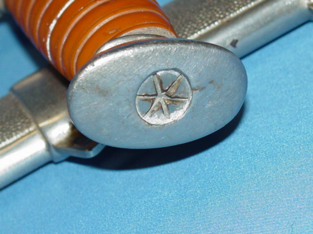 The design of the dagger consists of a swirl pattern celluloid handle. Orange in color. Unlike other daggers, it does not have any wire wraping around the handle. The pommel consists of a metal piece. Smooth surface. it has a multi-sided nut that holds it in place.