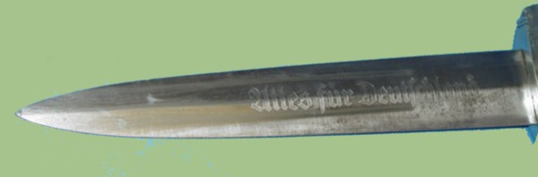 The blade of the NSKK dagger consists of a double edge, stileto style. The motto "Alles fur Deutchsland",