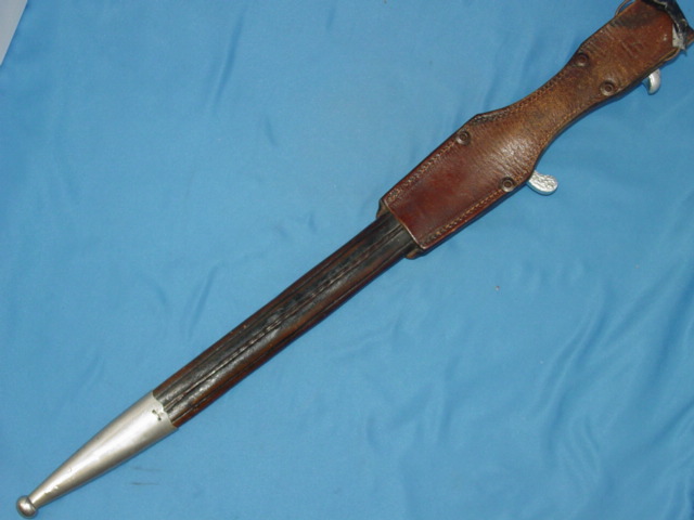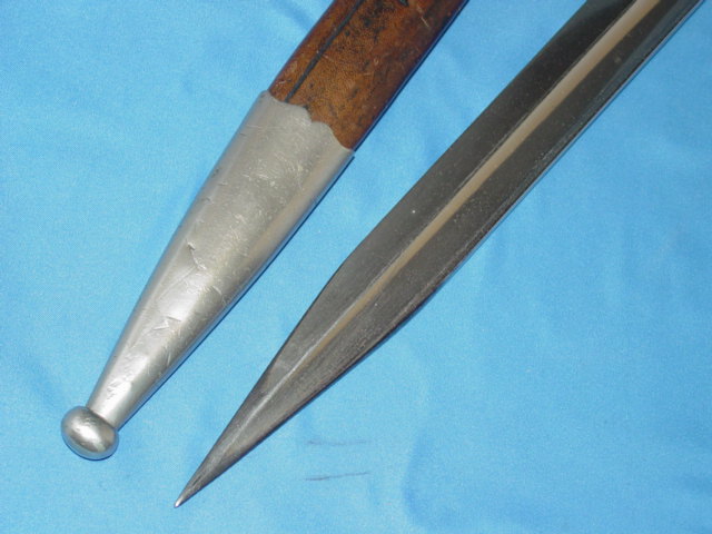 The tip of the scabbard is adorned with a large metal fitting. The top of this fitting shows