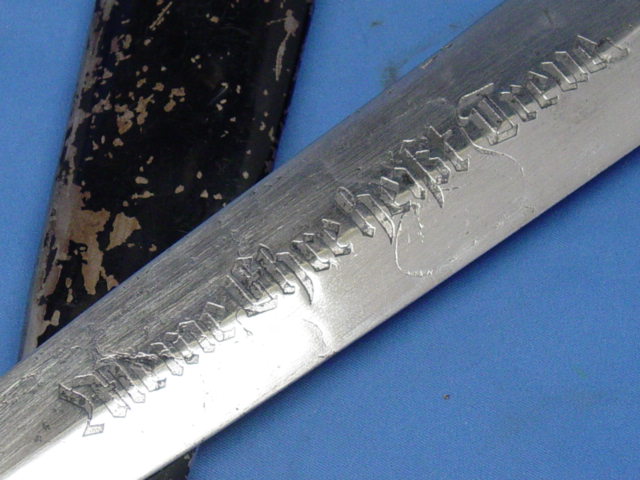 The blade has the inscription "Meime Ethre Heibt Treue" on one side. The other side