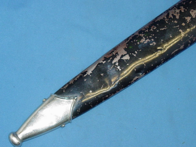 The scabbard is painted black to match the handle. It comes with two fittings. One