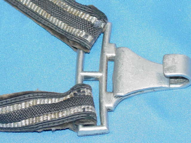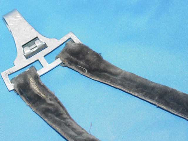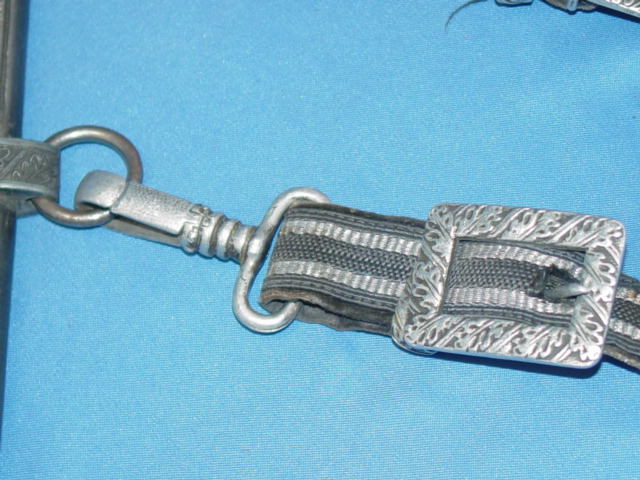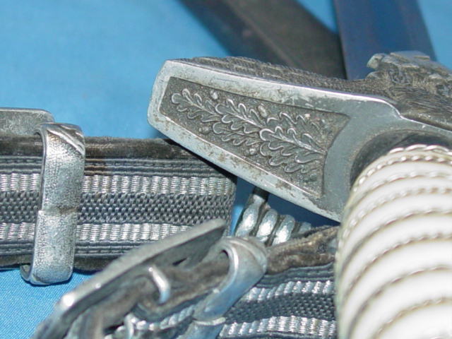 The dagger's hanger is made of heavy duty cloth. The front is nicely embroidered. The back has a felt like appearance. With metal fittings which include square buckles which have a leaf pattern.
