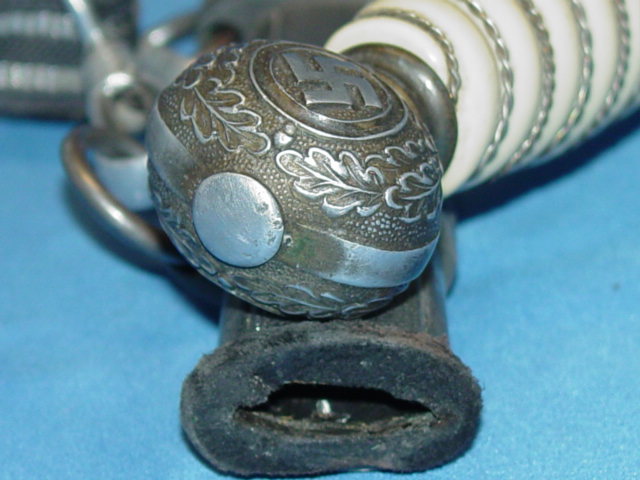 The pommel is of circular shape. A leaf pattern is applied to the front and the back. A swastika is placed in the center. The symbol was originally guilded, however normal wear causes it to wear out and be just plain silver in color. The pommel also has some pebbling.