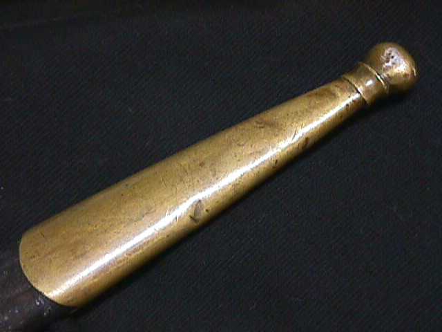 The scabbard is of leather construction with brass fittings, one in the throat area and one in