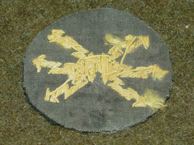 The patch consisted of a circle Of dark blue or dark green wool. Three intersecting yellow jagged