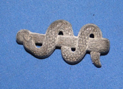 of an snake wrapping around a pole. Two pins are found in the back. That is how the device is attached to