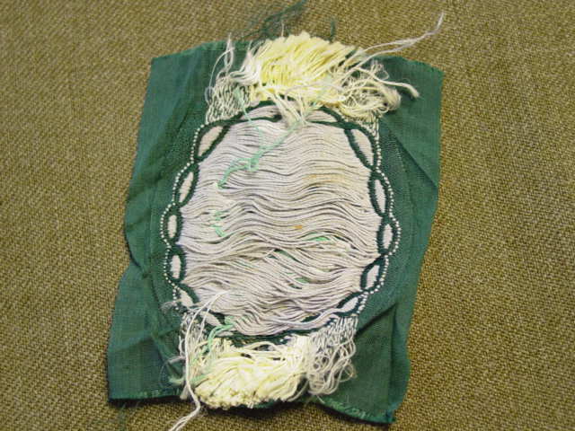 Of cotton construction, green background. A detailed embroidery of the flower is done in white thread. The