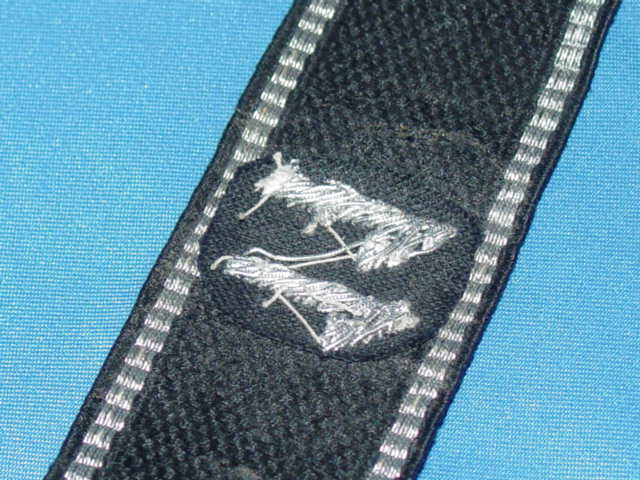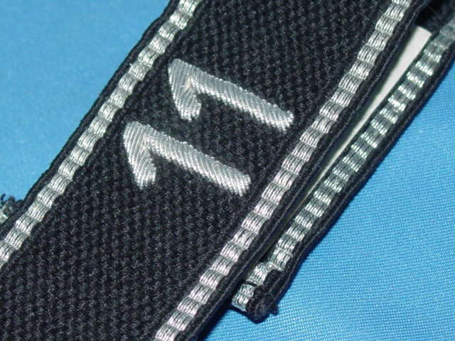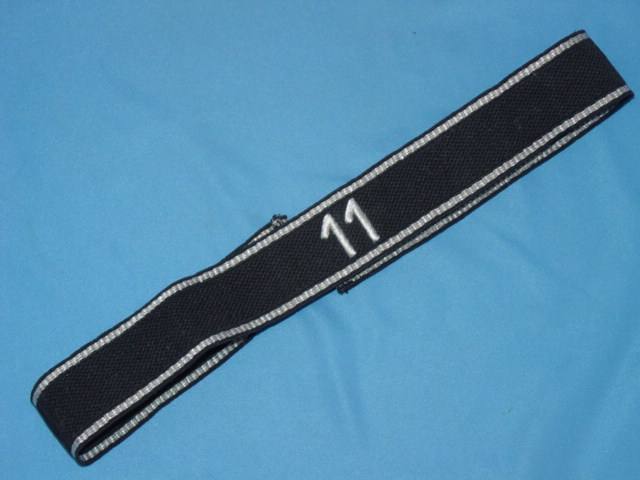 The item featured here is a German SS unit cuff title. of high quality construction. Machine woven, black rayon featuring the hand embroidered, SS-Fuss-Standarte, Arabic numeral, "11", in bright silver/aluminum wire threads. The cufftitle is bordered at both the top and bottom edges in seven strand, horizontally woven, bright, silver/aluminum wire threads.