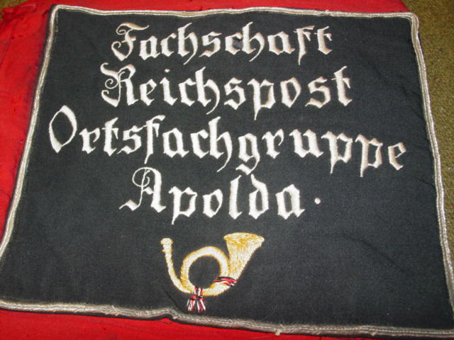 written in white gothic letters: FACHSCHAFT REICHSPOST ORTSFACHGRUPPE APOLDA, which