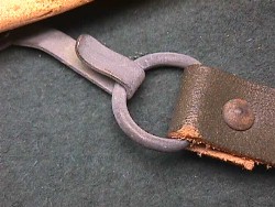 The leather chinstrap is secured by a hook on the inside of the helmet.