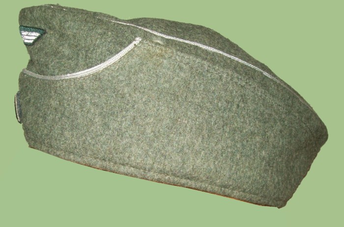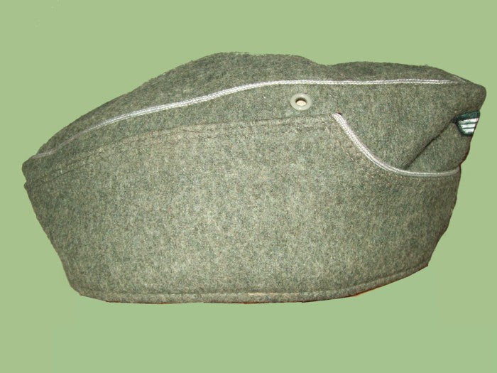 This is a German army field overseas hat. Of green wool construction with a white piping. The army eagle in cloth is applied to