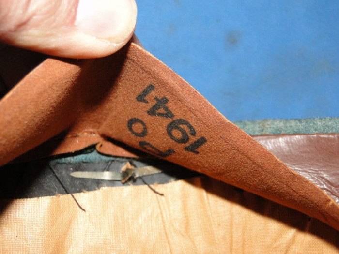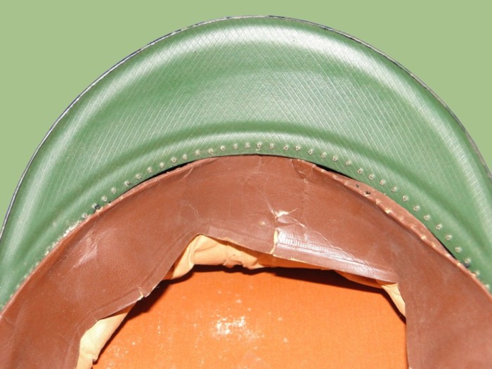 the mid section. Just above is the cockade. The inside of the hat is lined in a brown material. A leather sweatband is stitched all around