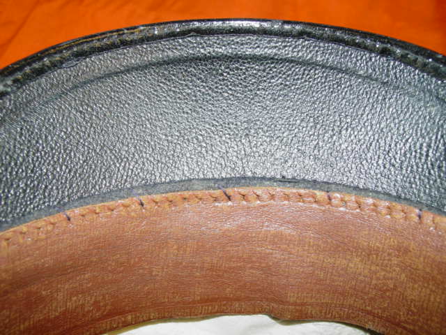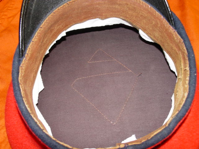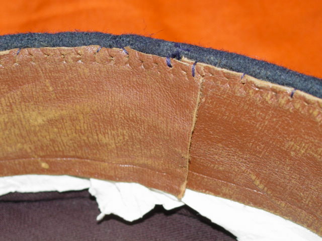 There are remnants of where the clear plastic diamond was sewn in. A brown leather sweatband is present.
