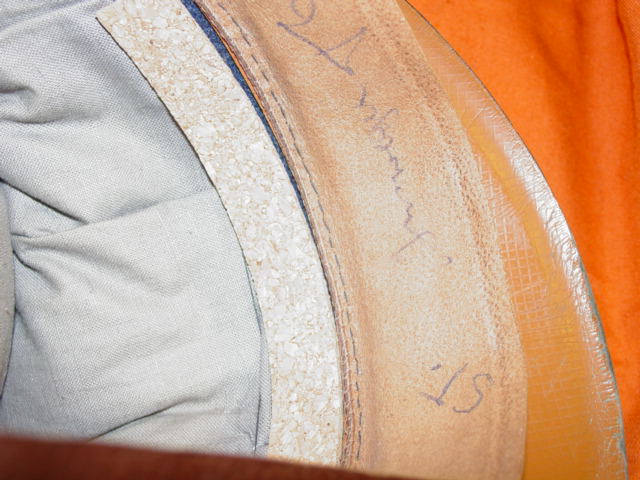 The sweatbad is made of light brown leather. The owner wrote his name with a blue pen. This was a