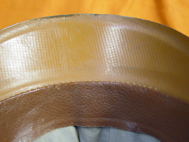 The visor is made of leather and is secured to the hat via stiches. The outer surface is black. The inner