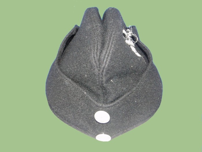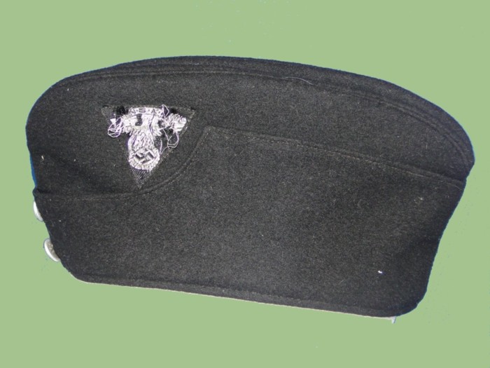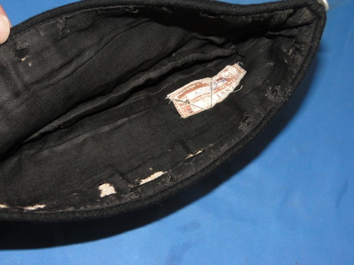 This is an overseas hat used by members of the NSKK. Of black wool construction. No ventilation gromets anywhere. The inside is