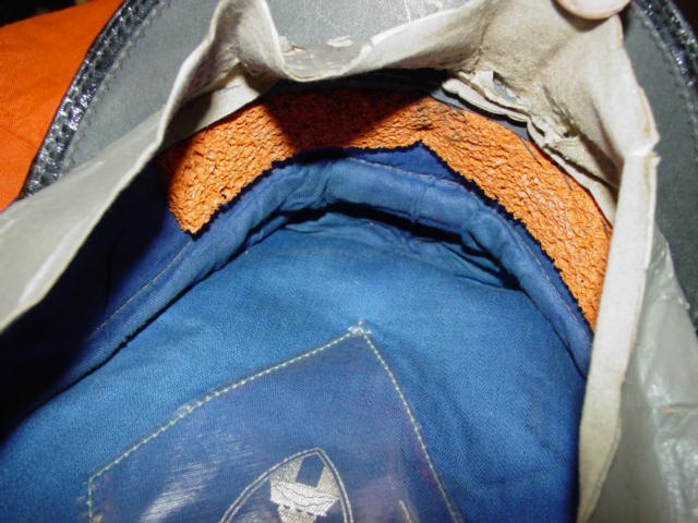 The inside of the visor is of smooth construction. The sweatband is of grey leather color. There