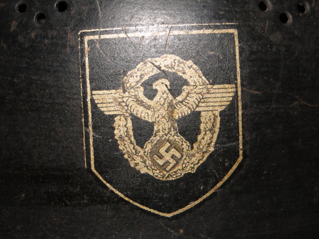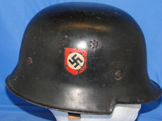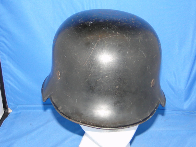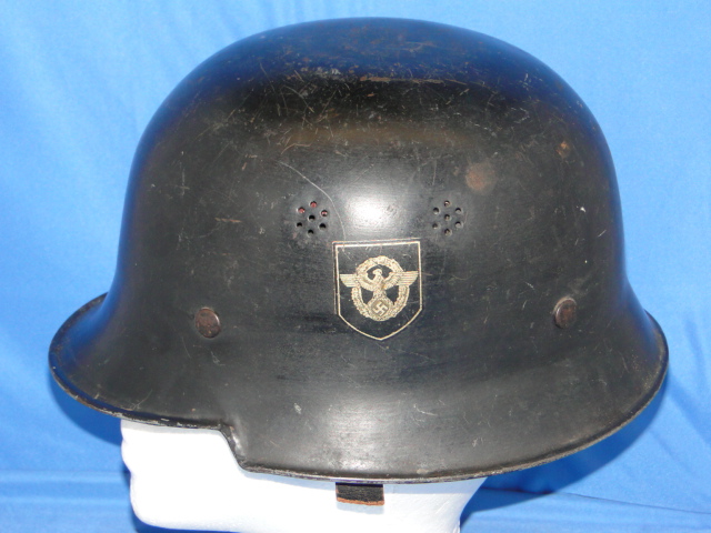This is a German helmet. As issued during World War Two. Used by the police in the cities. Lightweight Aluminum construction. painted Black. Two sets of five hole ventilation devices have been punched out on each side.