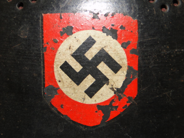 The helmet has two decals. One is a dark orange shield with a swastika in the center. The other displays a Silver police eagle.