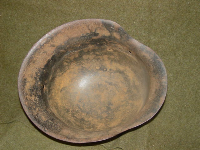 The liner and chin strap are missing. The rivets that held the aluminum ring that held the chin