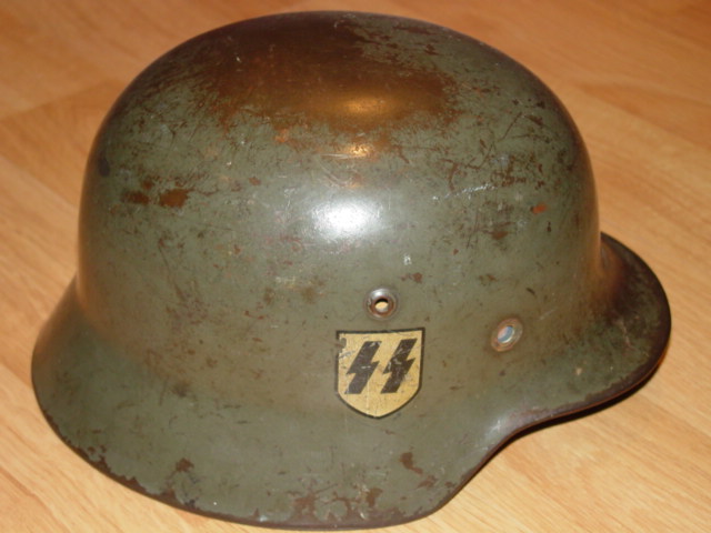 This is a WWII German SS Double Decal helmet.  With the classic pea green combat color. An M-35