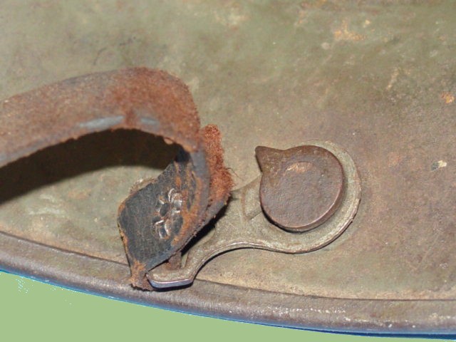 employed to secure the chin strap.  A small portion of the leather chin strap remains in place.