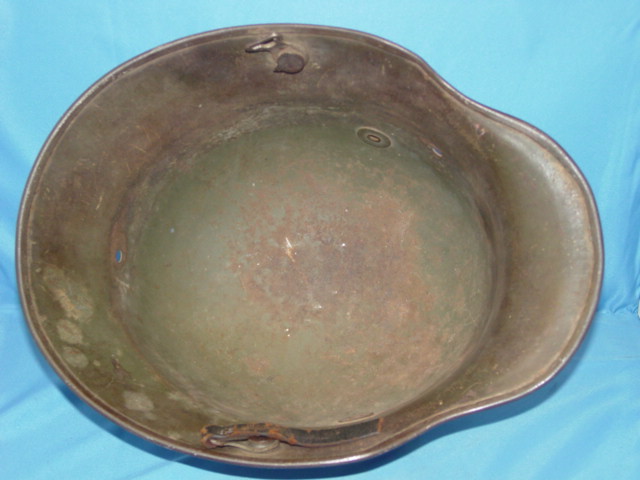 The liner of this helmet is missing. The inside retains the original paint.  A rivet holds the "D" ring