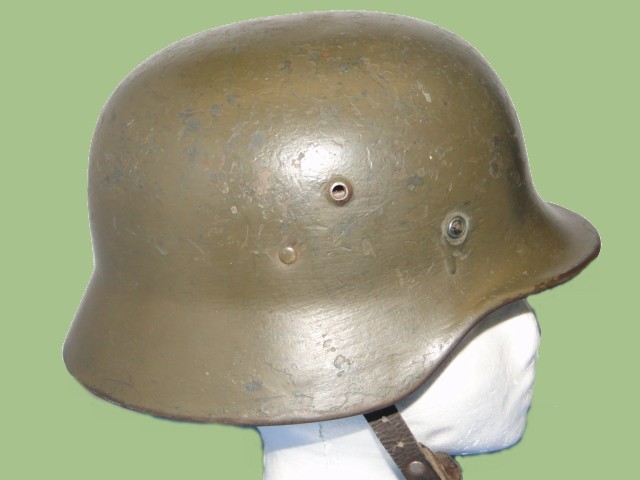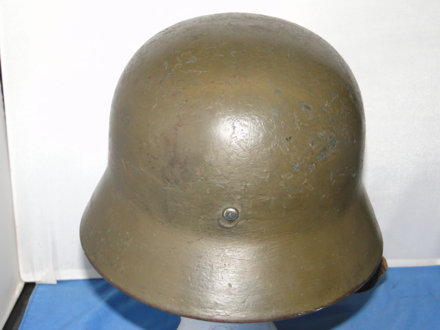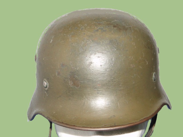 This is a German helmet. As issued during World War Two. Of steel construction. Rolled edges. The air vent is integrated. Green color.