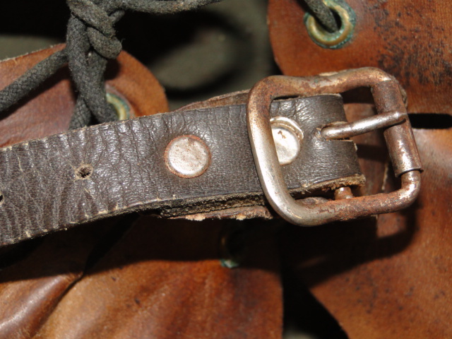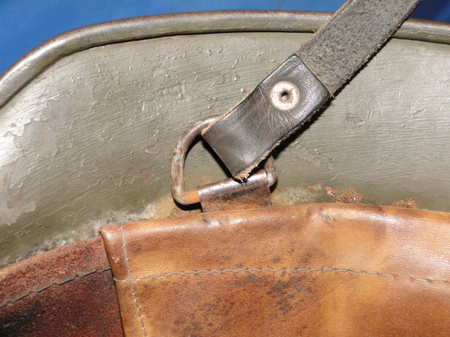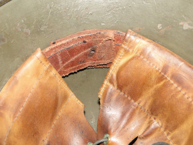 The original liner has been replaced. This one consists of a thick leather band secured to the main body. The liner consists of three padded fingers. "D" loop rings secured to the band provide an anchor for the chin strap.