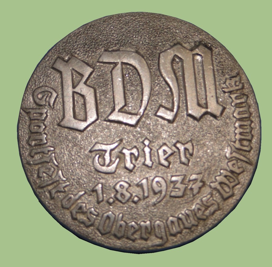 The design of the badge consists of a silver circle. The front reads "BDM Trier 1.8.1937". The perimeter reads