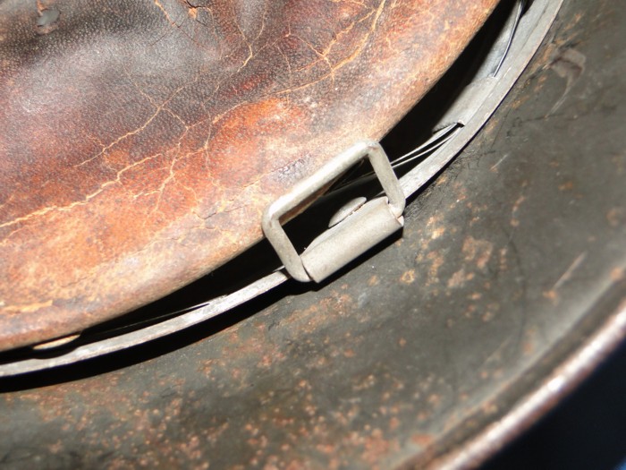 This is a German Army M-42 helmet. Rolled edge construction. Single decal. Integrated ventilation rivet. The leather liner
