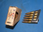 WWII GERMAN 8mm BULLETS WITH CASE This is a set of WWII German Mauser 8mm bullets in the stripper clip and issue box.
