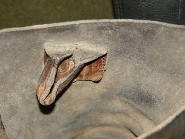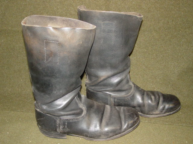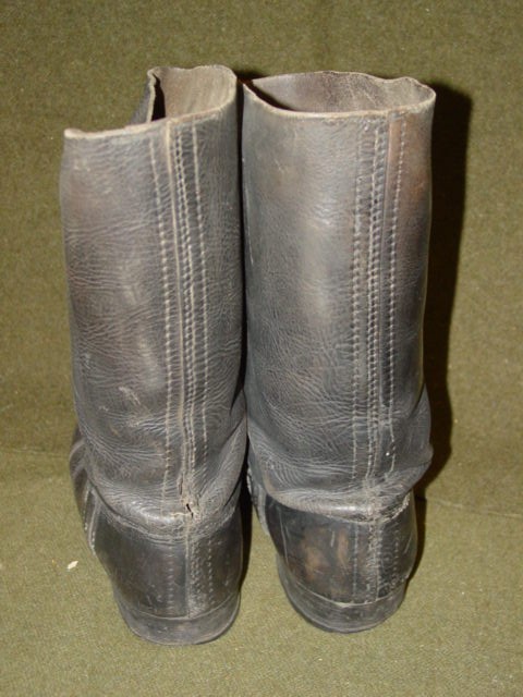 This is a set of German army boots. All leather construction. The inside top has a loop designed to help the soldier pull the boot up. The sole is plain. Markings are found in the heel area.