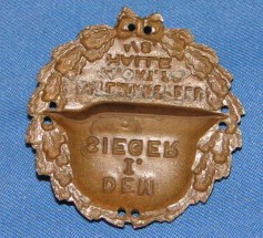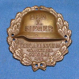 consists of a wreath with a helmet in the center. The words "Dem I. Sieger" are written on the helmet. It