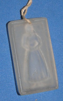 for adornign a Christmas tree. Of glass construction, rectangular in shape. The figure of a woman is