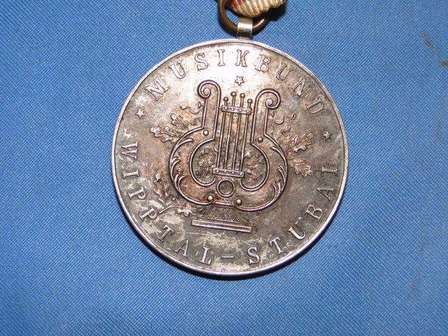 The front of the medal displays a harp with the words "Musikbund Wipptal Stubai" around the perimeter.