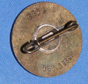 The back of the badge has a pin. The words "REDO" and "Ges Gesch" are found.