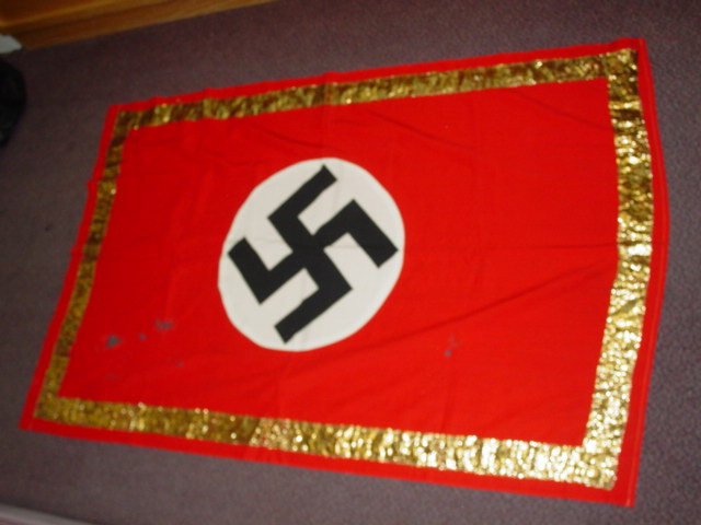 Rectangular shape with golden stipes along the perimeter of the flag. A swastika is placed in the center.