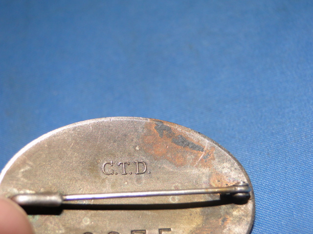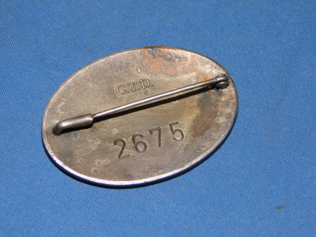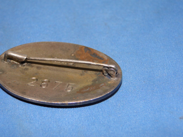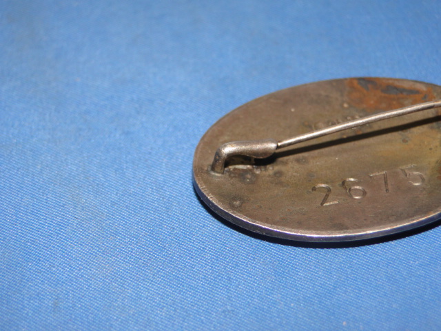 The back has a pin which is hinged on one end. It is numbered (2675). It also displays the markings of the