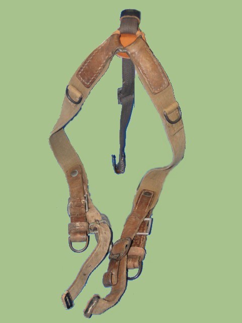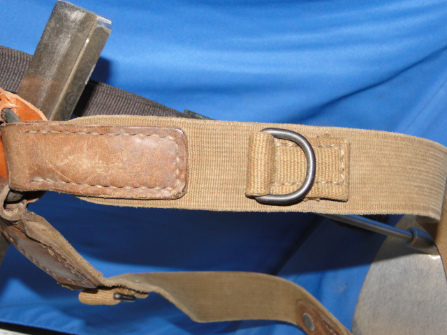 The load bearing harness is a combination of heavy duty canvis, leather and metal hooks. Rings were applied to the mid-front as a means to attach grenades, compass pouches and other items.