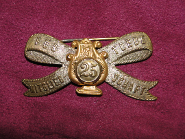 This is a German pin issued to veterans during the early 1900's. Of metal construction. In the shape of a bow. The design consists of a harp in the center with the number 25. The words "Fur Treue Mitglied Schaft" are distributed across the arms of the bow.
