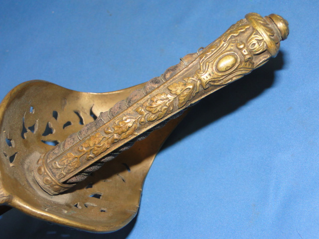 In overall very good condition. The scabbard is missing. The handle has a wooden grip that would be bound in leather. Most