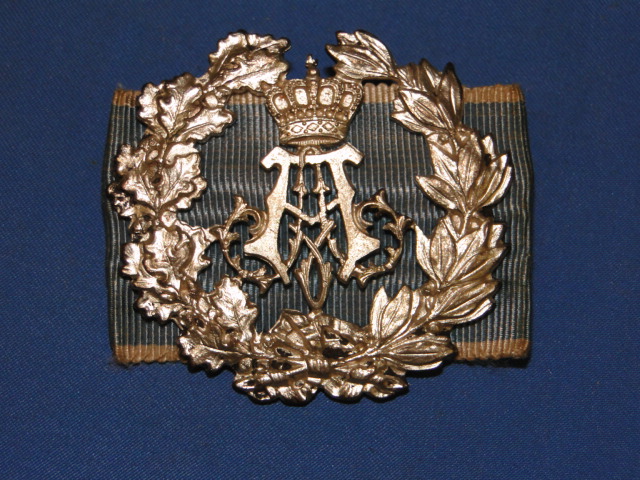 This is a large German ribbon. As issued to military personnel during WWI. The design consists of a rectangular shape cloth section. Light blue color with white bands on top and bottom. A silver metal wreath is attached to the front. The letter A with a crown on top are placed inside the wreath.