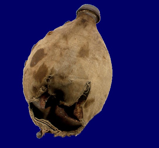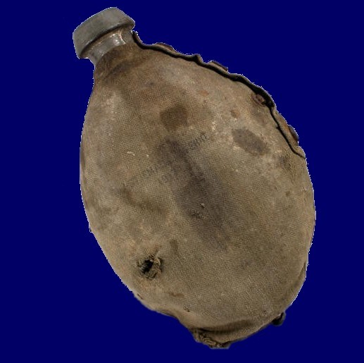 WWI GERMAN ARMY CANTEEN This is a German WWI canteen. Metal body covered in a light Khaki canvis. The bottom of this example has sustained considerable damage. This condition will affect the value. The cap is missing. The unit marking remains visible as it was stamped with black ink on the front of the cover.