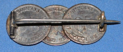 WWI IMERIAL GERMANY COIN BROOCHE The practice of making jewelry from common items was widespread in Germany during WWI. The item featured here is an example of such practice. Three coins have been soldered together to make a brooche. Silver color pin is secured to the back. Hinged on one end with a catch on the other.