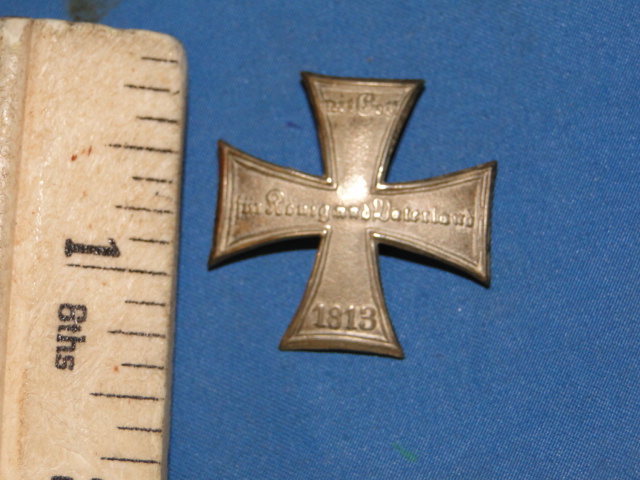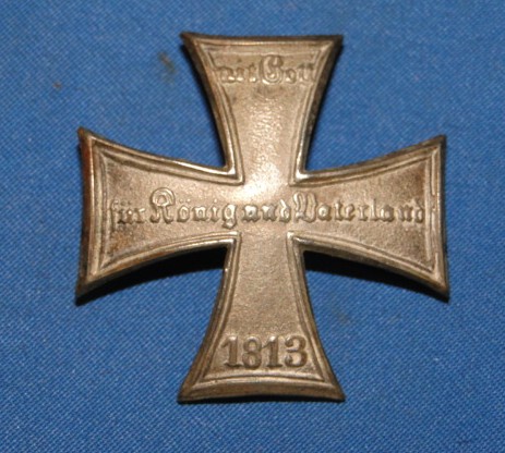 This is a German metal stamped iron cross. Manufactured during WWI. flat construction with the words "Mit Gott, in Ronigand Deutschland" are found. The date 1813 is placed in the lower arm.
