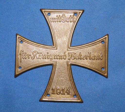 This is a German stamped Iron Cross. Two holes are placed in each corner of every arm. The top arm has "Mit Gott" written. The center shows "fur Ronigund Baterland". The bottom arm displays the date 1914.