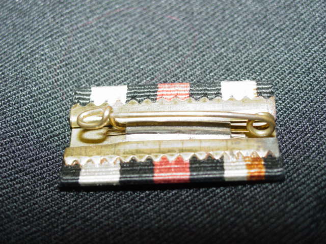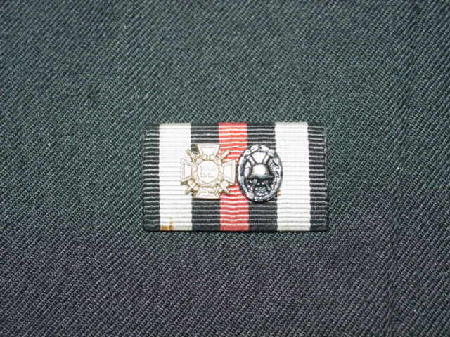 This is a WWI German Hindenburg  Cross with swords ribbon. This sample also has small metal devices of the Hindenburg cross and a black wound medal attached to the front of the ribbon.  Felt back construction with a metal base and pin used to affix the ribbon to a tunic.  Very high quality construction.