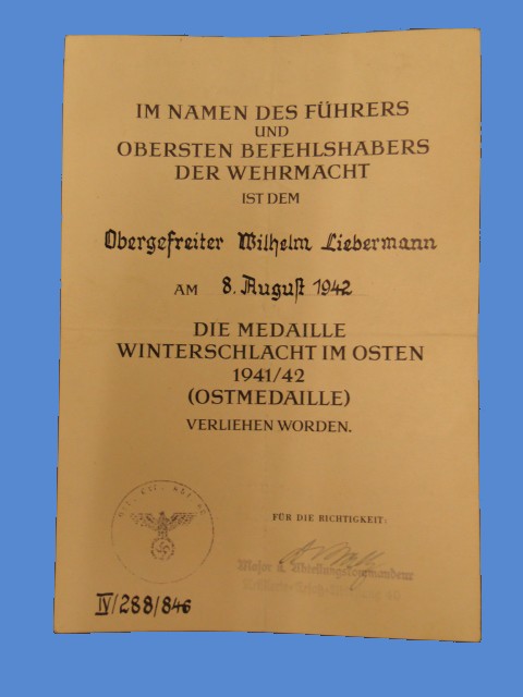 WWII GERMAN EASTERN FRONT MEDAL AWARD DOCUMENT -